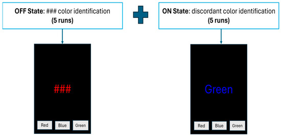 The specific outcomes recorded after the Stroop test were 1. OFF time (total time for five correct runs in the “OFF” state), 2. ON time (total time for five correct runs in the “ON” state), 3. time difference (ON time minus OFF time), and 4. total time (ON time plus OFF time) [,,].