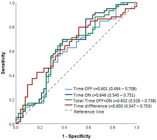 Using the area under the curve, the classification power of each time parameter was examined. The highest area value was present in time difference, followed by time ON, while the lowest area value was detected in time OFF (Figure 2). For presented parameters, cut-off values together with sensitivity (Sn) and specificity (Sp) were as follows: time difference 14.2 s (Sn = 0.610, Sp = 0.635), time ON 108.3 s (Sn = 0.695, Sp = 0.615), time OFF 99.8 s (Sn = 0.559, Sp = 0.654), total time 211.7 s (Sn = 0.644, Sp = 0.654). All area values significantly differed from 0.05 except for time OFF values.