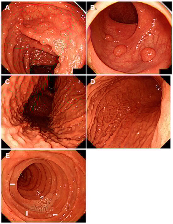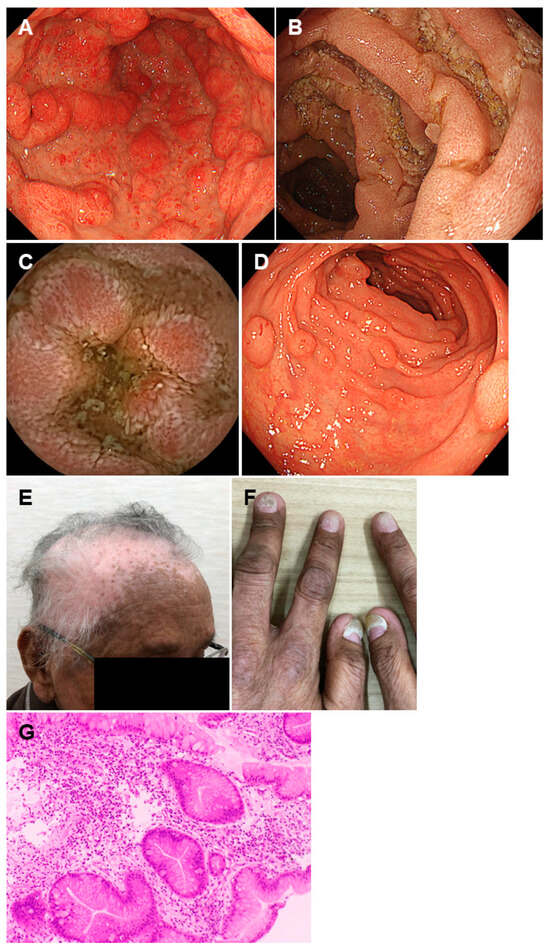 - Wang, W.; Shao, Y.; Zhao, D.H.; Xue, F.; Ma, X.B.; Li, Q.; Liu, C.X. Endoscopic and Pathological Characteristics of Cronkhite-Canada Syndrome: A Retrospective Analysis of 76 Cases. Turk. J. Gastroenterol. 2022, 33, 19–29. [Google Scholar] [CrossRef] [PubMed]