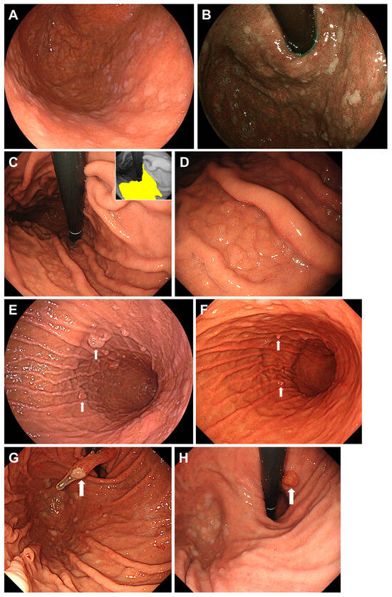 - Shimamoto, Y.; Ishiguro, S.; Takeuchi, Y.; Nakatsuka, S.I.; Yunokizaki, H.; Ezoe, Y.; Nakajima, T.; Matsuno, K.; Nakahira, H.; Tanaka, K.; et al. Gastric neoplasms in patients with familial adenomatous polyposis: Endoscopic and clinicopathologic features. Gastrointest. Endosc. 2021, 94, 1030–1042.e2. [Google Scholar] [CrossRef]