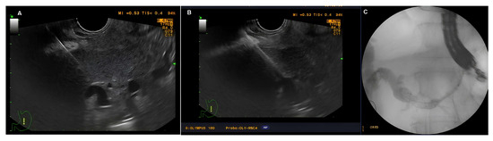 - Giovannini, M.; Dotti, M.; Bories, E.; Moutardier, V.; Pesenti, C.; Danisi, C.; Delpero, J. Hepaticogastrostomy by Echo-Endoscopy as a Palliative Treatment in a Patient with Metastatic Biliary Obstruction. Endoscopy 2003, 35, 1076–1078. [Google Scholar] [CrossRef]