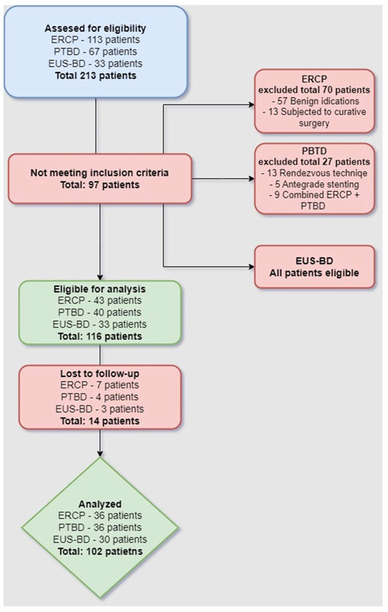 The study comprised 102 patients, divided into three groups as follows: 36 patients who underwent endoscopic retrograde cholangiopancreatography (ERCP), 36 patients treated with percutaneous transhepatic biliary drainage (PTBD), and 30 patients who underwent endoscopic ultrasound-guided biliary drainage (EUS-BD) (Figure 5).