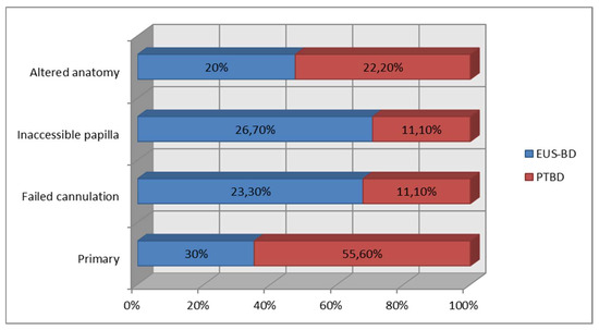 The decision for PTBD and EUS-BD was primary or determined by various factors such as altered anatomy, inaccessible papilla, failed cannulation, etc. A summary of the decision-making process is presented in Figure 7.