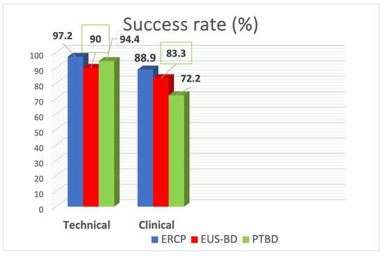 Similarly, the clinical success rate did not show significant differences that could be associated with the type of treatment (p = 0.182); however, the highest rate was achieved in the ERCP group and the lowest in the PTBD group: 88.90% ERCP group (n = 32); 83.30% EUS-BD group (n = 25); and 72.20% PTBD group (n = 26) (Figure 8).