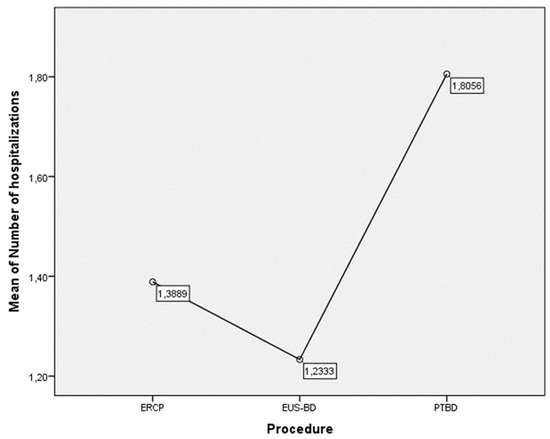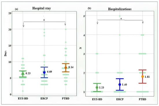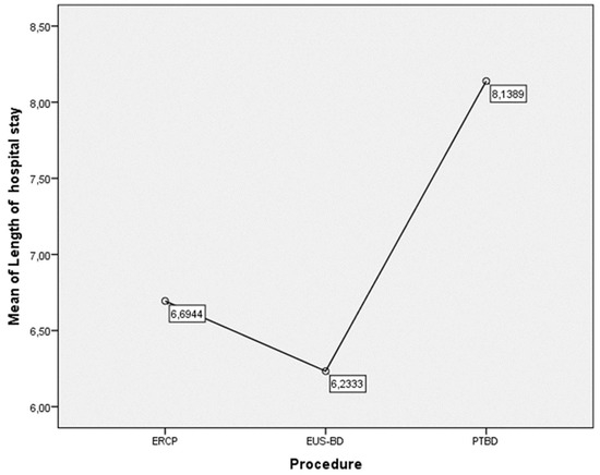 The mean duration of hospitalization for the patients in the EUS-BD treatment group was 6.23 ± 2.48 days, compared to 6.69 ± 3.81 days in the ERCP group and 8.14 ± 3.77 days in the PTBD group. A statistically significant difference in hospital stay was observed between the EUS-BD and PTBD groups (p = 0.017). The individual length of hospitalization ranged between 1 and 11 days in the EUS-BD group, compared to a wider range (3 to 20 days) in the other two groups (Figure 10a and Figure 11).