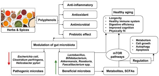 Herbs and spices are an integral part of our daily diet. From time immemorial, these have been used for seasoning foods and are still consumed for culinary purposes. They improve the taste, color, and flavor of food and beverages, making them more palatable [1]. In addition to their widespread role as condiments, they have also garnered attention for promoting health and reducing disease risk. They are enriched with health-promoting bioactive constituents, including polyphenols, terpenes, and alkaloids [2]. Mainly, these constituents exhibit antioxidant, antimicrobial, and anti-inflammatory activities and are also responsible for modulating the gut microbiota (GM) [3]. The GM comprises a highly heterogeneous community of microbes (prokaryotic bacteria and archaea, fungi, and eukaryotic parasites and viruses). Thus, the GM is considered important in its role to facilitate digestion and maintain host health and homeostasis. It regulates the host’s immune functions and is crucial in healthy aging and longevity. Hence, a right balance must exist for the GM to flourish, or its dysregulation may lead to improper bodily functions, ultimately giving rise to various age-related chronic diseases [4].