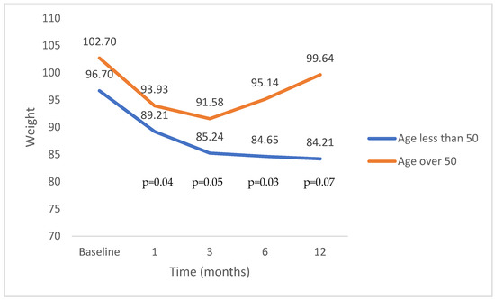 Figure 4. Total body weight loss among different ages according to periods of 1, 3, 6 and 12 months.