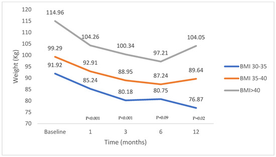 Figure 6. Total body weight loss among different obesity class groups according to periods of 1, 3, 6 and 12 months.