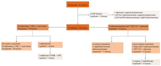 A flowchart of the patients and lesions is presented in Figure 1. ESD failed in three patients who underwent curative surgical therapy in the same hospital admission: a large 100 mm ascending colon adenoma and two colon adenocarcinomas exhibiting a “muscle retracting sign”. One R0-resected 30 mm ascending colon adenoma harbored a 4/7 mm submucosal poorly differentiated (G3) NET (mixed adenoneuroendocrine carcinoma).