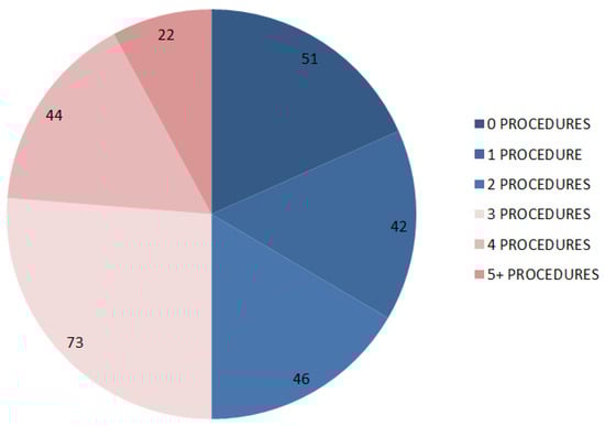 The propensity score matching identified 139 pairs of patients. The post-matching comparison of the baseline characteristics of the study groups revealed no significant differences in the key variables (Table 4). The prevalence of patients who achieved disease control was similar across the study groups (48.2 vs. 49.6%, p = 0.905). The total number of locoregional procedures is reported in Figure 1.