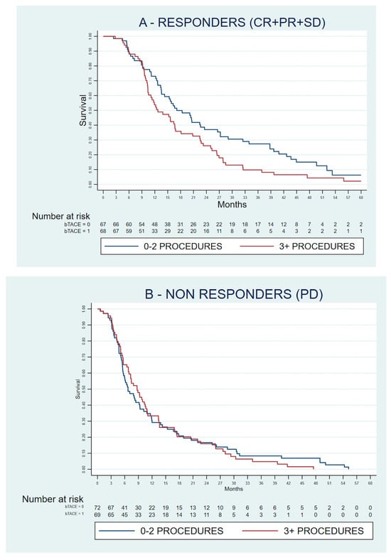 A specific subgroup analysis was designed, distinguishing patients whose imaging response was progressive disease from those who achieved disease control (defined as either complete response, partial response or stable disease) according to the mRECIST criteria. This choice was made to better capture the potential effects of receiving multiple TACE procedures in the long term, as non-responders were far more likely to die from a rapidly progressing HCC than from liver failure. Similar subgroup analyses have been used to investigate the survival correlates of the improved management of sorafenib over time and other effects that might impact the long-term survival of sorafenib-treated patients [16,17].