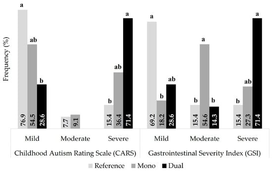 Frequency of gastrointestinal symptoms and ASD-like behaviors stratified by immunoreactivity to BMC. Different superscript letters within the same severity level, documented using CARS [] and GSI [] questionnaires, mean significant differences (p < 0.05).