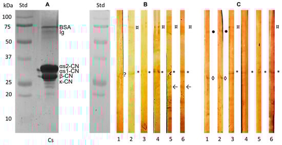 Bovine milk caseins (BMC) subfractions and their immunodetection in participants with dual immunoreactivity (IgG+/IgA+) to BMC. Laemmli’s SDS-PAGE of mixed BMC (A) and corresponding IgA (B) or IgG (C) immunoblots identifying αS1/S2 (*), β (◊), κ (arrow) caseins (CN), milk immunoglobulin (Ig, ●), bovine serum albumin (BSA, ¤), negative signal (?).