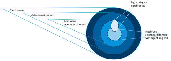 In the late 1990s, the World Health Organization developed a histological classification of colorectal cancers []. The following different subtypes were introduced—classical adenocarcinomas (ACs), which account for the large majority of cases; mucinous adenocarcinomas (MACs); signet-ring-cell carcinomas (SRCCs); and other less common types such as small-cell carcinoma, squamous-cell carcinoma, medullary carcinoma, undifferentiated carcinoma, and primary signet-ring-cell carcinoma of the colon and rectum (PSRCCR). The classification is presented in Figure 1.