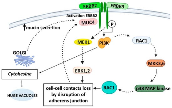 Mechanism of signet-ring-cell carcinoma development in the gastrointestinal tract. MUC4 and ErbB2 interact and trigger an activation loop of ERBB2/ERBB3-MUC4-ERBB2/ERBB3. This signaling pathway becomes activated and has the potential to disrupt adherent junctions, resulting in the loss of cell–cell contacts. MUC4, mucin 4; ERBB2, human epidermal growth factor-like receptor 2; ERBB3, human epidermal growth factor-like receptor 3; PI3K, phosphatidylinositol 3-kinase; p38 MAP, p38 mitogen-activated protein kinases; RAC1, Rac family small GTPase 1. The image was created with BioRender (https://biorender.com/ accessed on 25 July 2024).