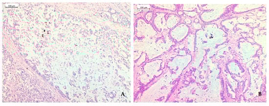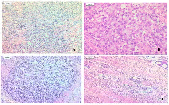 SRCC is commonly found in the stomach (95%) but can also be seen in the colon, rectum, ovary, peritoneum, breast, and gallbladder [,,]. More than 90% of colorectal carcinomas are adenocarcinomas originating from epithelial cells of the colorectal mucosa, followed by other rarer types of colorectal carcinomas, including neuroendocrine, squamous, adenosquamous, spindle cells, and undifferentiated carcinomas []. Classical adenocarcinoma is characterized by the formation of glands, which is the basis of the histological classification of the tumor. In well-differentiated adenocarcinoma > 90% of the tumor is composed of acinar (glandular) structures; in moderately differentiated adenocarcinoma, the acinar structures are in 50–90%, while poorly differentiated adenocarcinoma is mostly solid, and acinar structures are found <50% [,]. In practice, about 70% of colorectal adenocarcinomas are diagnosed primarily as moderately differentiated. Only 10 and 20% of cases are revealed to be well and poorly differentiated, respectively [].