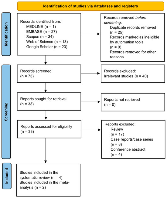 Figure 1 shows the database search strategy used to identify the included studies. A total of 98 studies were identified, of which 25 duplicates and 40 irrelevant studies were removed. Thirty-three records were assessed for eligibility, of which 17 reviews, 8 case reports/case series and 4 conferences abstracts were removed, leaving 4 studies for full-text review. Four studies were included in the systematic review [16,17,18,19] and two studies in the meta-analysis [16,17]. Kochhar et al. reported the prevalence odds ratio which could not be approximated to HR [18], while Ungaro et al. provided the odds ratios of CD and UC after recent and past history of bariatric surgery [19]; given the inconsistent reporting of those two studies, it was decided to exclude them from the meta-analysis.