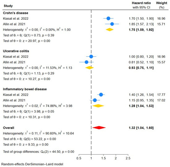 Figure 2 shows the meta-analysis of two studies evaluating the risk of new onset IBD following bariatric surgery [16,17]. The overall pooled adjusted HR of the new onset IBD following bariatric surgery versus the non-exposed groups was 1.32 (95% CI: 1.04–1.60). Our pooled analysis found a significant risk of new onset IBD (HR: 1.28, 95% CI: 1.04–1.53, I2 = 74.9%) and CD (HR: 1.75, 95% CI: 1.59–1.92, I2 = 0) following bariatric surgery. However, no significant UC risk (HR: 0.93, 95% CI: 0.75–1.11, I2 = 11.5%) was found. The overall heterogeneity of the included studies was high (I2 = 90.6%).