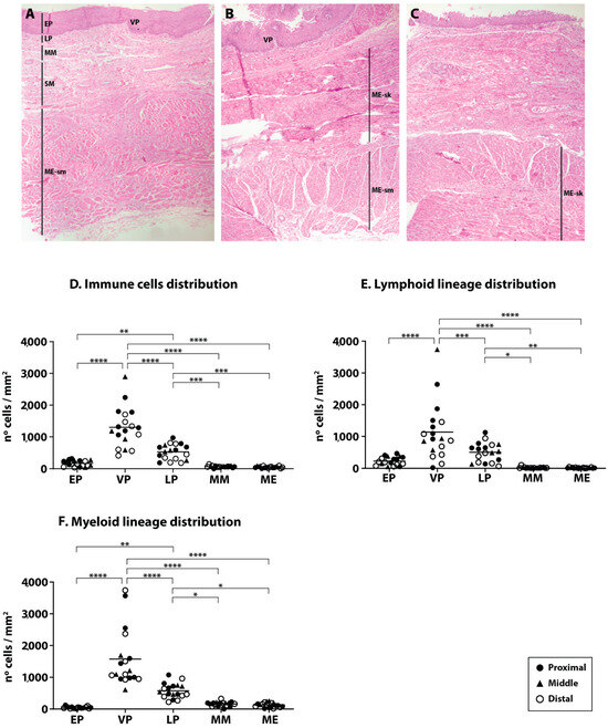 Esophageal anatomical layers and distribution of immune cells within the human esophagus. Representative images of the proximal (A), middle (B) and distal (C) esophageal histological structure. The different layers are indicated as EP (epithelium), VP (vascular papillae) LP (lamina propria), MM (muscularis mucosae), SM (submucosa), ME (muscularis externa), sm (smooth muscle) and sk (skeletal muscle). (D) Distribution of immune cells. Each individual represents the average of all the immune cells, analyzed based on the surface markers (CD3, CD4, CD8, CD20, CD68, tryptase and MBP). (E) Lymphoid lineage distribution. Each individual represents the average of all the immune cells analyzed from the lymphoid lineage (CD3, CD4, CD8 and CD20). (F) Myeloid lineage distribution. Each individual represents the average of all the immune cells analyzed from the myeloid lineage (CD68, tryptase and MBP). Normally distributed data were compared by One-Way ANOVA. Data not following normality were compared by Kruskal–Wallis test. Multiple comparisons were corrected using Tukey’s multiple comparison test (parametric) or Dunn’s multiple comparisons test (non-parametric). (* p = 0.05; ** p = 0.01; *** p = 0.001, **** p < 0.0001.).