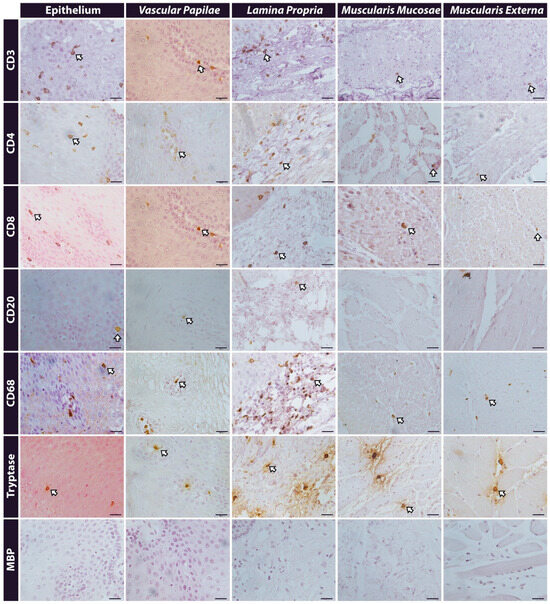 The different immune cell populations were identified in the esophageal anatomical layers observed (epithelium, vascular papillae, lamina propria, muscularis mucosae and muscularis externa) within the proximal, middle and distal esophagus, after each immunostaining procedure (Figure 1, Figure 2 and Figure S1). Positive controls of the stainings are shown in Figure S2.