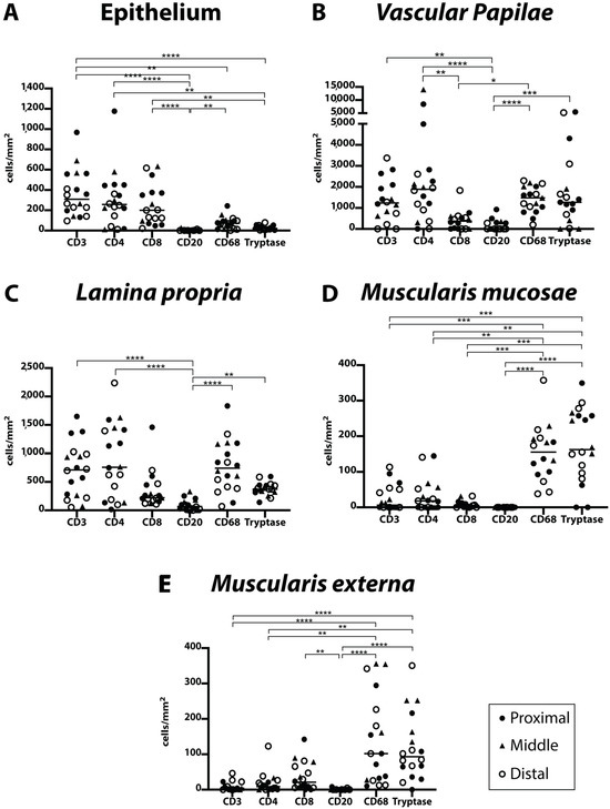 Distribution of immune cell populations in each esophageal layer. Quantification of each immune cell population within the epithelium, vascular papillae, lamina propria, muscularis mucosae and muscularis externa for each esophageal region (proximal, middle, distal). The Kruskall–Wallis test was performed for every cell type comparison. Dunn’s multiple comparison test was used for adjusted p-value calculations (* p = 0.05; ** p = 0.01; *** p = 0.001, **** p < 0.0001).