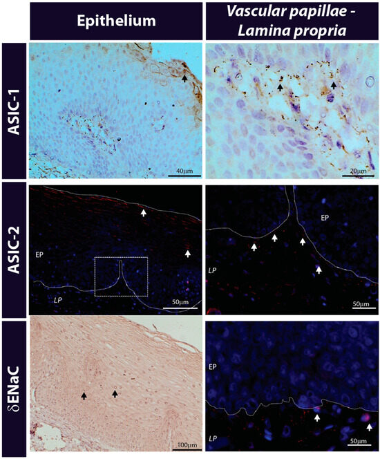 Acid-sensing receptors in the human esophagus. Representative images of the ASIC-1 staining, observed in the functional layer of the epithelium (external) and under the basal cell layer of the epithelium, the vascular papillae and the lamina propria. Representative images of the ASIC-2 staining, observed in the functional epithelial cells and in nerve fibers in the lamina propria. Representative images of δENaC positive staining observed in nerve endings in the lamina propria of vascular papillae. In each image, arrows point at positive staining. The dotted-square insert illustrates the staining in the vascular papillae and lamina propria (right column). EP: epithelium, LP: lamina propria. Arrows indicate positive staining. The dotted line delineates the epithelium. The scale of the IFA images is 50 µm.