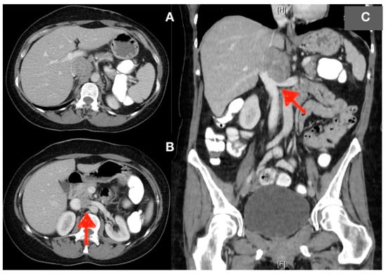 (A) CT image showing a lesion within the inferior vena cava with displacement of the hepatic hilum. (B) Axial section: opening of the left renal vein into the inferior vena cava (red arrow) is interrupted. (C) Coronal section: showing broad contact (red arrow) of the mass with the left renal vein without interrupting flow. The images correspond to patient number 12. As can be observed in the image, the lesion is identified in the region below the supra-hepatic veins. In this patient, a circumferential resection of the inferior vena cava was performed with replacement with a Goretex prosthesis. The patient exhibited no postoperative complications.