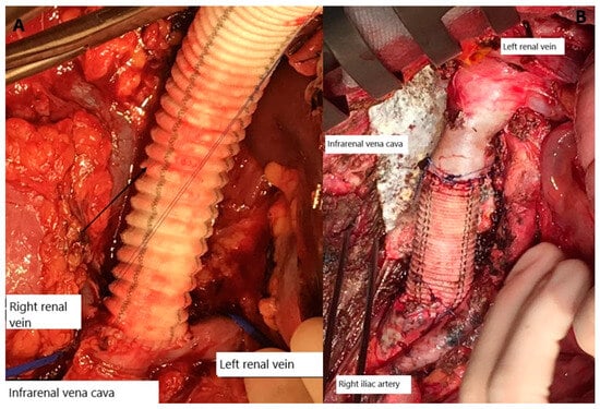 (A) Intraoperative image corresponding to the case of Figure 1 showing the replacement of the inferior vena cava with synthetic prosthesis, including left renal vein opening. (B) Intraoperative image corresponding to patient no. 7. Infrarenal vena cava reconstruction with prosthesis.