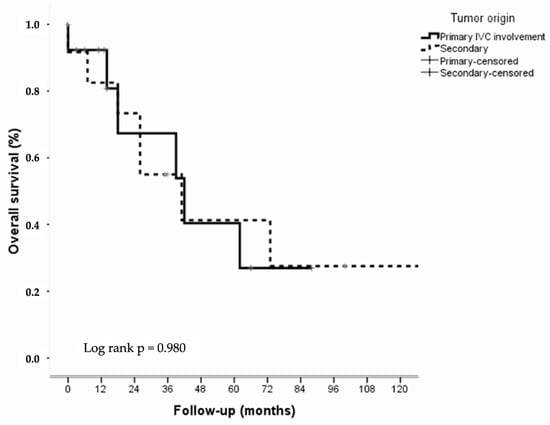 The subgroup analysis revealed that there was no statistical significance in overall survival rates between patients with primary or secondary tumors, and 1, 3 and 5-year OS rates were 91%, 68% and 41% in primary IVC involvement and 83%, 54% and 42% in secondary disease (p = 0.980).