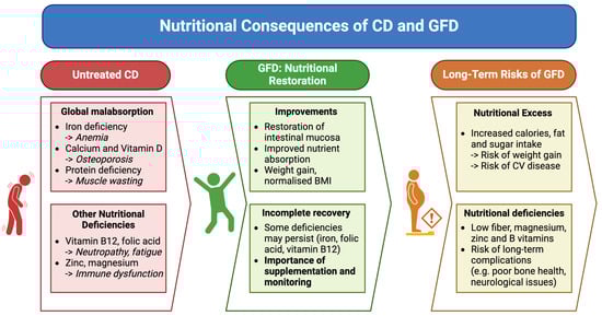 Figure 1. Nutritional consequences of celiac disease (CD) and gluten-free diet (GFD). This figure summarizes the key nutritional impacts of untreated CD, the improvements seen after adopting a GFD, and the potential long-term risks associated with the diet. Untreated CD is characterized by global malabsorption, leading to deficiencies in iron, calcium, vitamin D, protein, and other micronutrients. While a GFD leads to significant improvements in nutrient absorption and weight normalization, the incomplete recovery of certain nutrients may persist. Additionally, long-term adherence to a GFD can result in nutritional excesses, such as increased fat and sugar intake, and deficiencies in fiber, magnesium, zinc, and B vitamins, posing risks for long-term complications, including cardiovascular disease and poor bone health. Created with “Biorender.com”, accessed on 9 May 2024. Abbreviations: BMI, body mass index; CD, celiac disease; CV, cardiovascular; GFD, gluten-free diet.