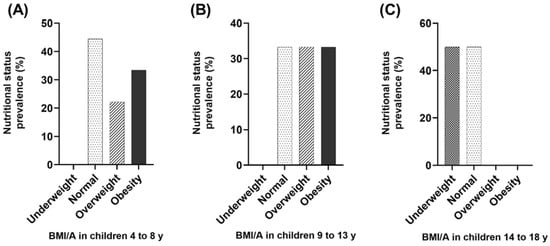 Evaluation of body mass index-for-age (BMI/A) indicator in children and adolescents with ASD (Z-scores interpretation). (A) BMI/A in 4-to-8-year-old children (n = 9); (B) BMI/A in 9-to-13-year-old children (n = 9); (C) BMI/A in 14-to-18-year-old children (n = 6).