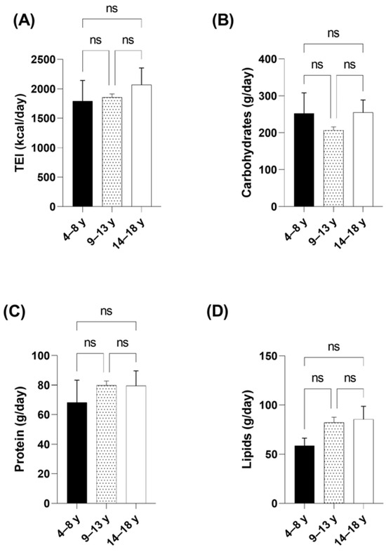 Comparison of energy and macronutrient intake stratified by age group in children and adolescents with ASD. (A) Comparison of total energy intake (TEI) by age group. (B) Comparison of carbohydrate intake by age groups. (C) Comparison of protein intake by age groups. (D) Comparison of lipid intake by age groups. Data are presented as mean and SEM. Statistical test used: ANOVA, significance at p < 0.05. ns: not significant.