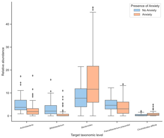 Figure 1 shows the differences in relative microbiota abundance between the Anxiety and No Anxiety Group by target taxonomic level.