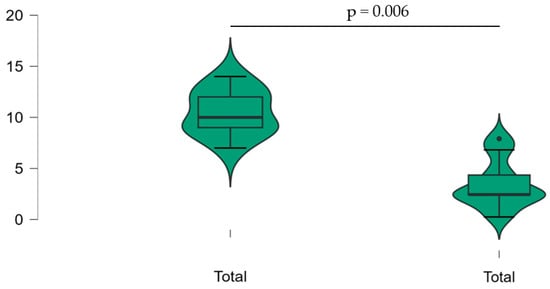 The mPDAI demonstrated a significant reduction from baseline after 12 months, decreasing from a median score of 9 to 1 (p = 0.034). Remission, defined as an mPDAI score of ≤4 and a reduction of ≥2 points from baseline, was achieved by five out of six patients (83.3%). The distribution of the mPDAI is depicted in Figure 2.