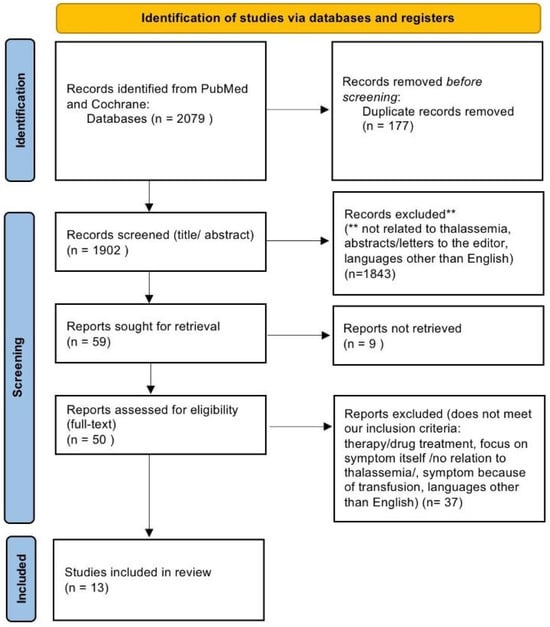 This systematic review aimed to investigate gastrointestinal (GI) pathologies associated with thalassemia and to identify the contributing factors for their development. Following the PRISMA guidelines, a comprehensive search was conducted across PubMed, the Cochrane Library, and Google Scholar using the following search terms: (“Thalassemia” OR “Thalassemia major”) AND (“Gastritis” OR “Esophagitis” OR “Colitis” OR “Ischemic colitis” OR “Perforation” OR “Infection” OR “Ileitis” OR “Inflammatory bowel disease” OR “Celiac disease” OR “Gastrointestinal diseases” OR “Hemorrhagic colitis”). As shown in Figure 1, the initial search yielded 2079 studies after the removal of 177 duplicates. 1902 studies were screened. Of these, 1843 studies were excluded for reasons such as a lack of relevance to thalassemia patients with GI manifestations or because they consisted of letters, conference abstracts, review articles, or studies primarily focused on pregnancy- or lactation-related complications, as well as blood transfusion-related pathologies. 59 studies were sought for full-text review, but 9 could not be retrieved. Of the 50 studies assessed for eligibility, 37 were excluded for reasons such as focusing on therapies/drug treatments, no relation of symptoms to thalassemia, or being in languages other than English.
