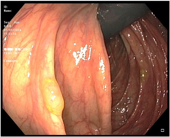 Indigo Carmine is a deep-blue contrast dye that penetrates into mucosal grooves, thereby enhancing the visualization of surface patterns (Figure 3). A multicenter RCT by Pohl et al. [] demonstrated that a chromoendoscopy with Indigo-Carmine-spraying significantly increased the overall ADR adenomas (0.95 vs. 0.66 per patient), flat adenomas (0.56 vs. 0.28), and serrated lesions (1.19 vs. 0.49) compared to a standard colonoscopy. Conversely, Lesne et al. reported no significant difference in the ADR when comparing a blue-water infusion colonoscopy to a standard colonoscopy, although the adenoma-per-colonoscopy was significantly higher in the blue-water infusion group [].
