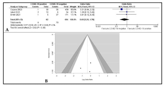 (A) A forest plot and (B) a funnel plot of the primary included studies estimating the association between rebleeding and COVID-19 infection among GIB patients. [21,28,30].