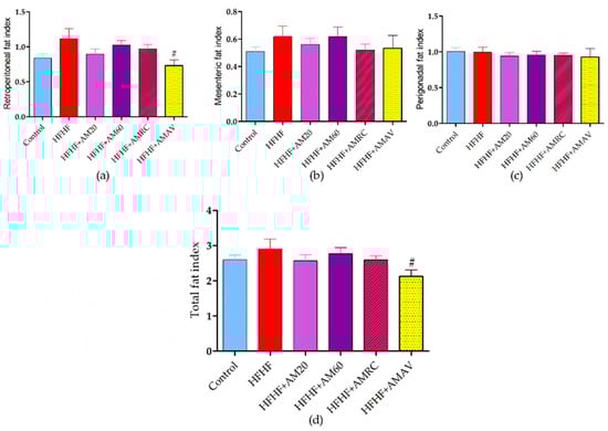 Retroperitoneal (a), mesenteric (b), perigonadal (c), and total fat (d) indices in rats fed a high-fat high-fructose (HFHF) diet and treated with Aronia melanocarpa fruit juices produced at 20 °C (AM20) and at 60 °C (AM60) and Aronia melanocarpa fruit juices enriched with Rosa canina (AMRC) and Alchemilla vulgaris (AMAV); # p < 0.05 vs. HFHF group.