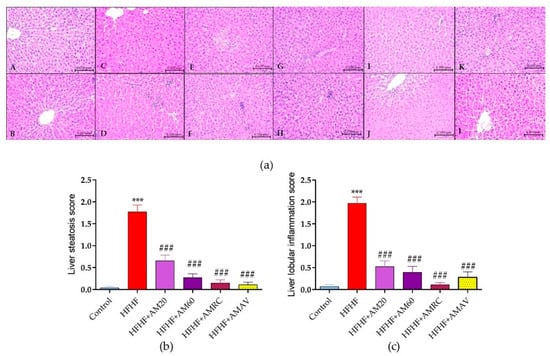 The liver lobular inflammation score was also significantly higher (p < 0.001) in the HFHF group compared to the Control (1.97 ± 0.14 vs. 0.07 ± 0.05). All AMBFJ-treated groups demonstrated a significantly (p < 0.001 vs. HFHF) reduced lobular inflammation score (0.52 ± 0.13, 0.39 ± 0.14, 0.11 ± 0.05, and 0.28 ± 0.13 for groups HFHF + AM20, HFHF + AM60, HFHF + AMRC, and HFHF + AMAV, respectively) (Figure 5c).