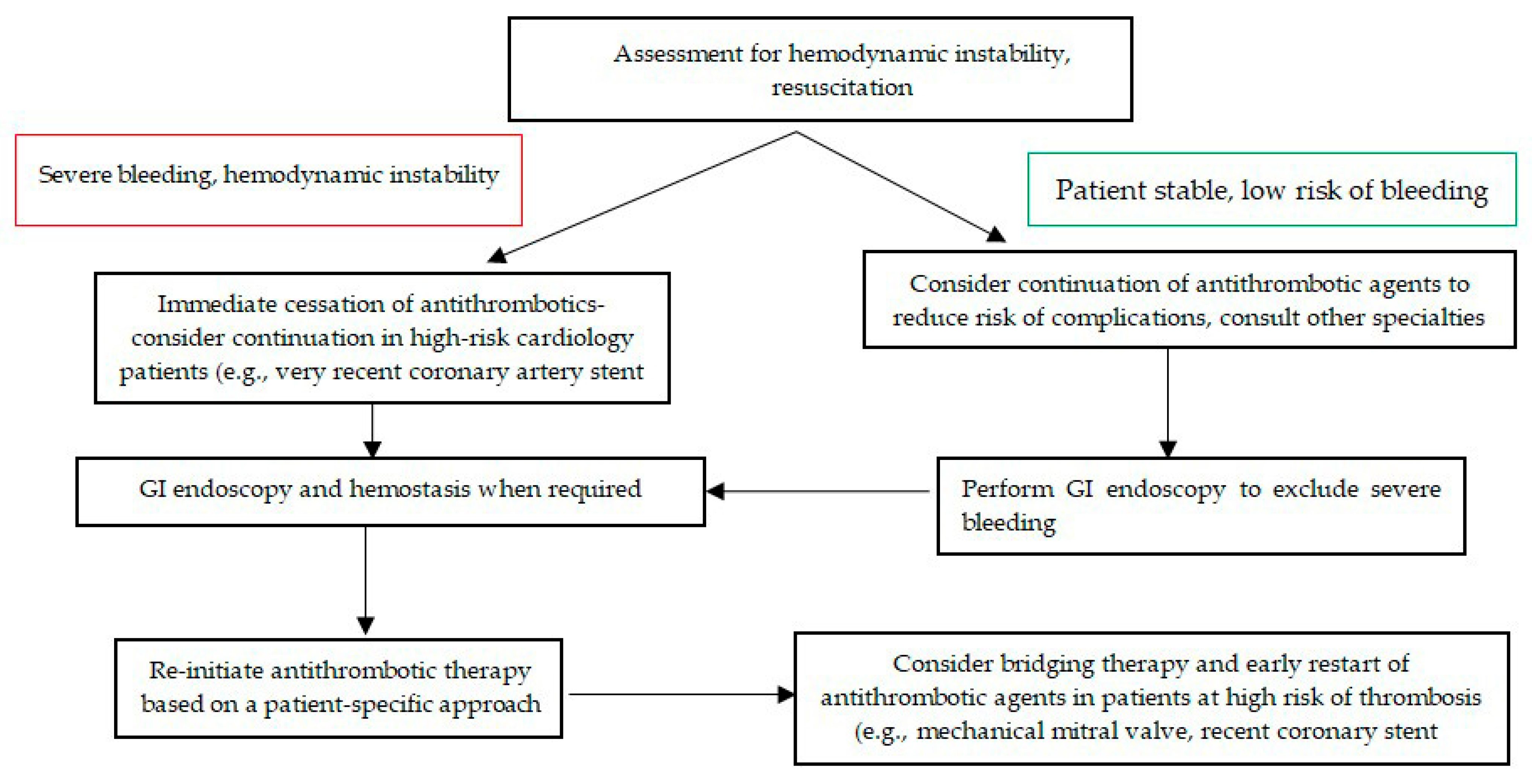 Patients presenting with GI hemorrhage while on antithrombotic agents should be rapidly assessed for hemodynamic stability and need for resuscitation but also for their bleeding and thromboembolic risk (