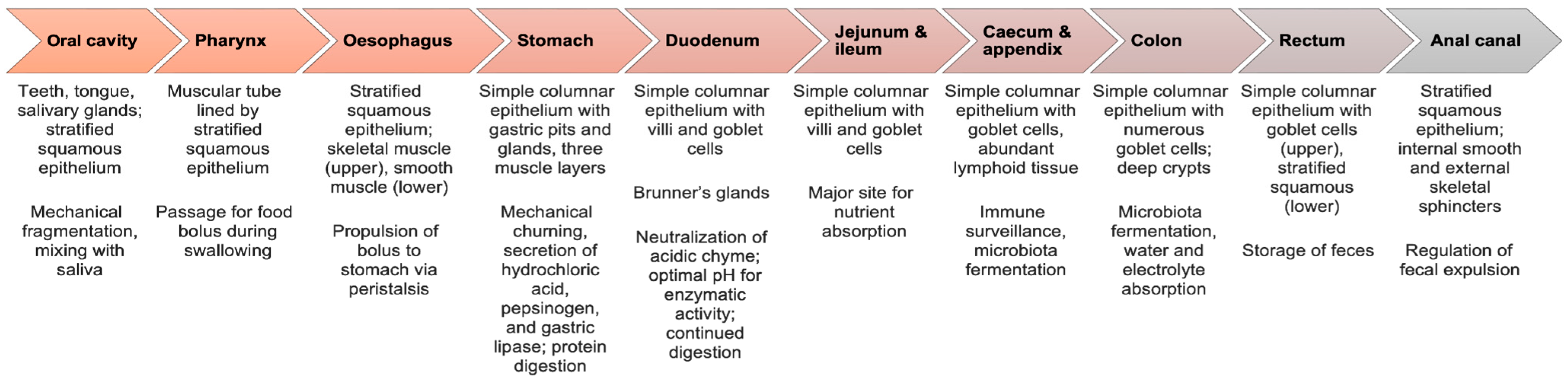 Figure 1. Main structures and their functions in the gastrointestinal tract. A schematic illustration of the human gastrointestinal tract showing the passage of food starting from the oral cavity and ending at the anal canal. This schematic illustration emphasises the epithelium type, specific histological characteristics, and main physiological functions related to each part of the gastrointestinal tract.