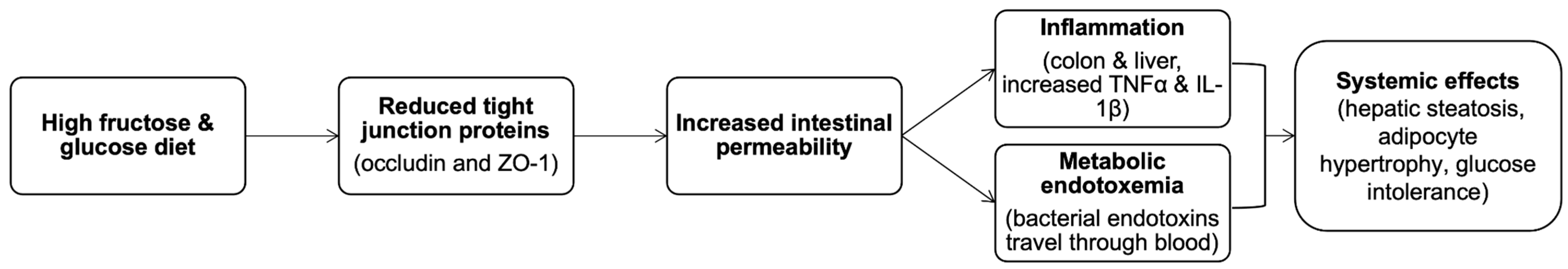 A diet rich in fructose and glucose may increase intestinal wall permeability. However, the studies are ongoing, and this question should be perceived as open. For now, most of the research is conducted on mice. An experiment in which mice were orally fed such a diet showed higher plasma levels of FITC–dextran, indicating higher intestinal wall permeability in mice. They also had fewer tight junction proteins in the colon, such as occludin and ZO-1, responsible for controlling gut wall permeability [35]. Diet-induced increased gut permeability has been shown to correlate positively with inflammation, which was assessed in the study using inflammatory cytokines. Also, a state called metabolic endotoxemia can develop, meaning that endotoxins from intestinal bacteria can travel through the blood, causing an inflammatory response in tissue elsewhere. Mice that were fed a high-fructose or high-glucose diet had significantly higher expression of TNF-α and IL-1β in the colon. Similar results were seen in the liver, joined by increased expression of MCP1 and TLR4 proteins. The histological analysis of liver tissue showed increased lipid accumulation, leading to hepatic steatosis (more severe in mice fed with a high-fructose diet). In both diet models, similar adipocyte hypertrophy was observed, as well as glucose intolerance and increased fasting blood glucose concentration. Thus, high glucose and fructose consumption can increase intestinal permeability, in turn stimulating inflammation [2,36]. A schematic representation of this process of alterations in mice caused by GIT morphology due to a high-fructose and -glucose diet is shown in Figure 2.