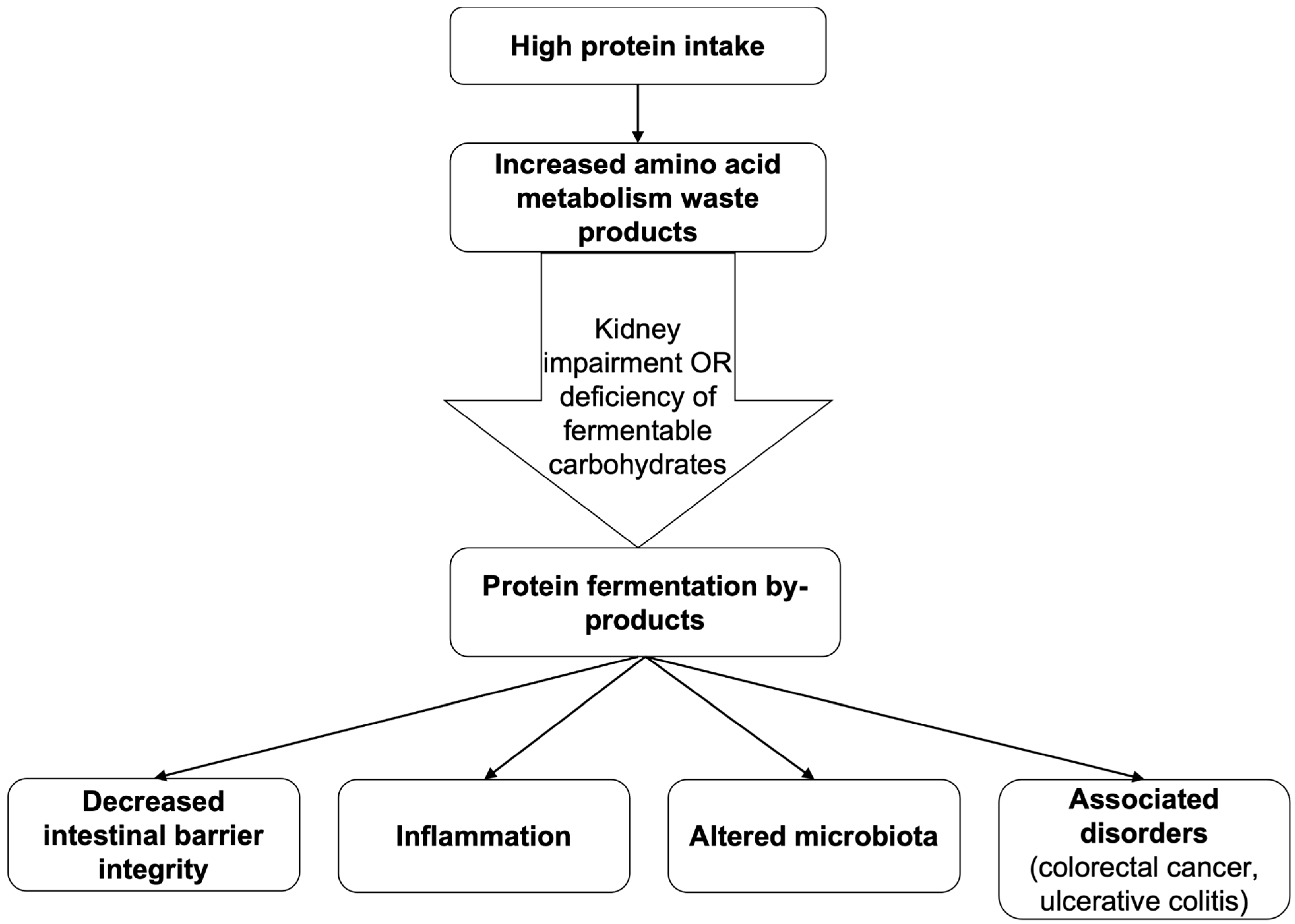Figure 3. Effects of excessive protein consumption on the gastrointestinal tract. An illustration of the proposed mechanisms linking excessive protein consumption to intestinal dysfunction. Changes caused by increased protein intake mostly manifest if the kidneys cannot effectively discharge waste products, such as urea and ammonia, from amino acid metabolism or when a shortage of fermentable carbohydrates is present. In this case, protein fermentation and production of ammonia and other by-products increase. This results in a decline in intestinal barrier integrity, inflammation, lowered pH, and subsequent changes in microbiota, as well as pathogenesis of colorectal cancer, ulcerative colitis, and other gastrointestinal disorders.