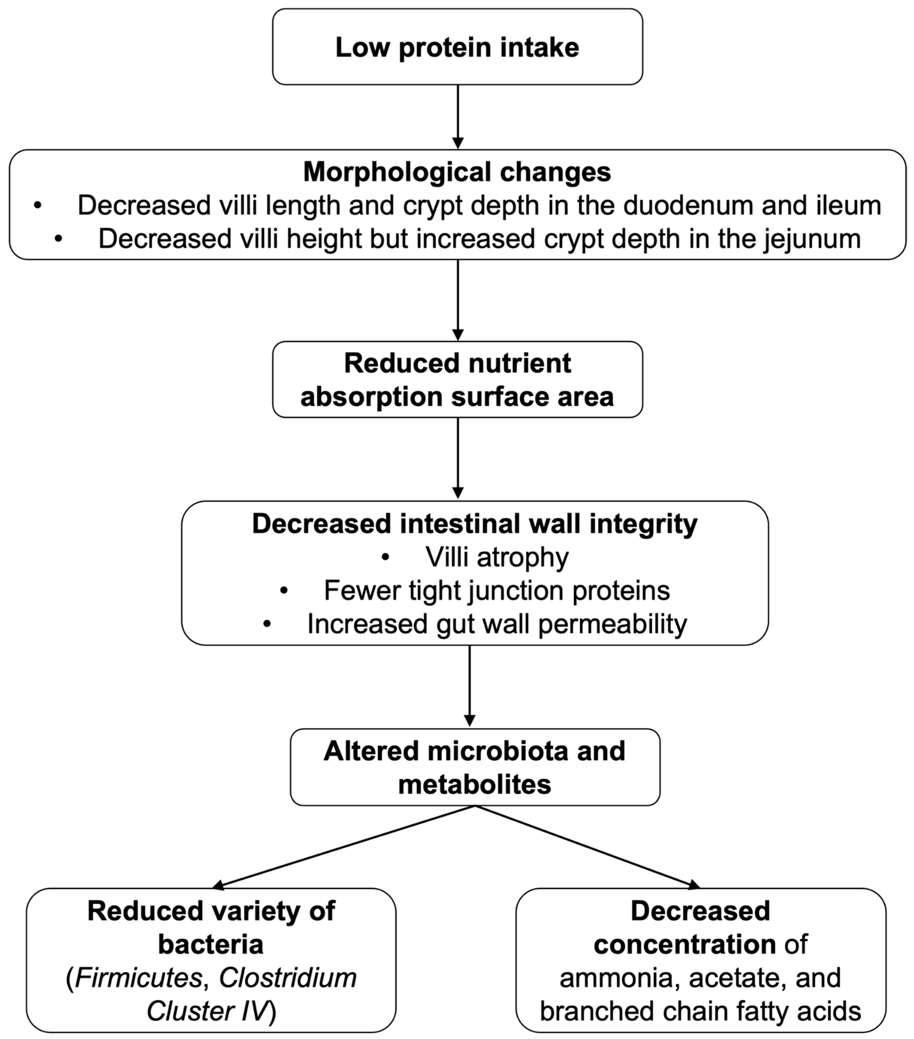 Figure 4. Effects of protein deficiency on the gastrointestinal tract. A visual representation of the effects of low protein intake on the gastrointestinal tract. Protein deficiency in the diet leads to morphologic changes in the small intestine, including decreased villi height and crypt depth in the duodenum and ileum, but decreased villi height and increased crypt depth in the jejunum. This is followed by a decrease in nutrient absorption surface area and a decrease in intestinal wall integrity, characterised by villi atrophy, fewer tight junction proteins, and increased intestinal wall permeability. In the protein-deficient environment, the intestinal microbiota and their metabolites become altered, leading to a reduced variety of bacteria (e.g., Firmicutes and Clostridium Cluster IV) and a decreased concentration of ammonia, acetate, and branched-chain fatty acids.