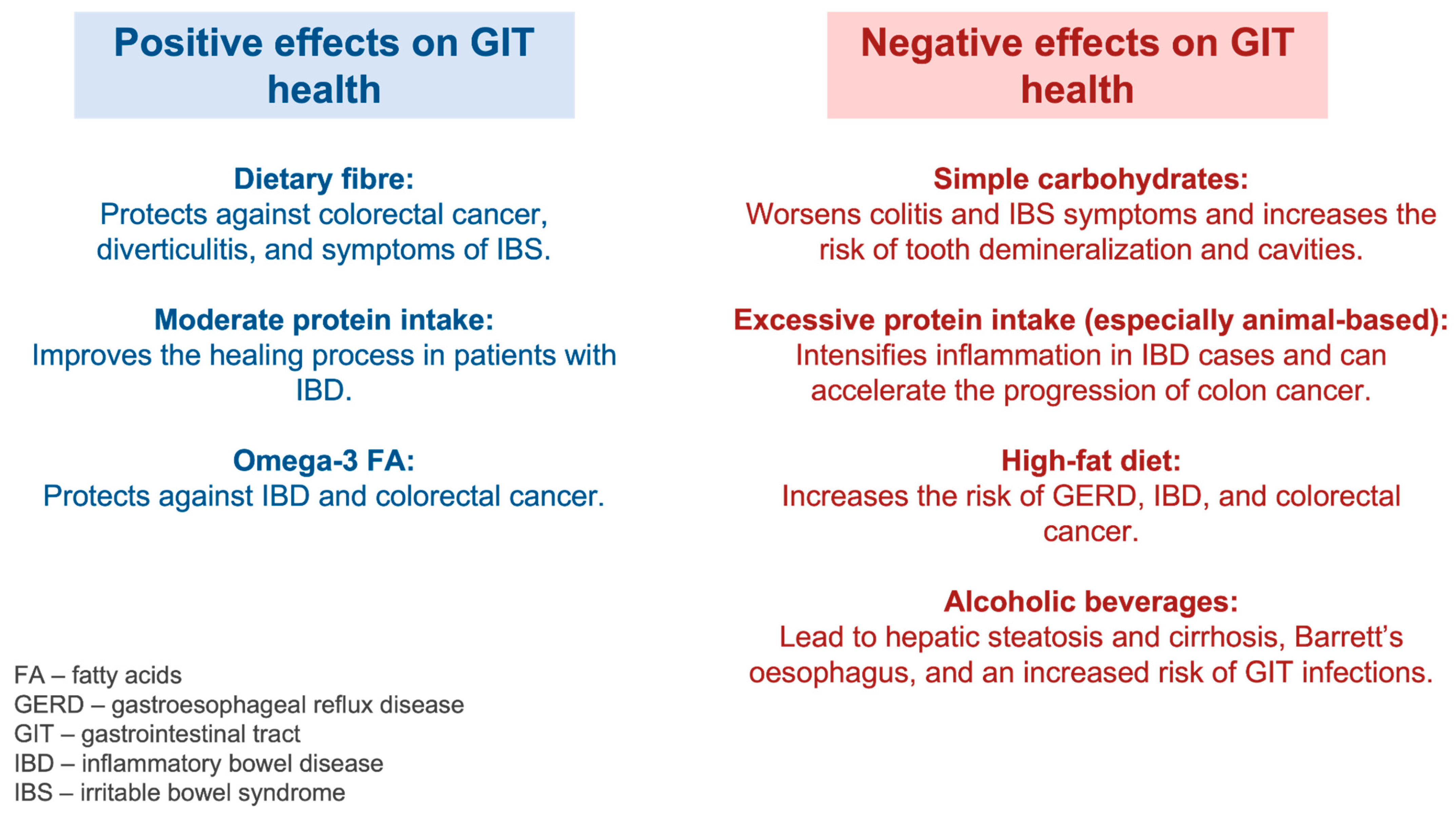 Figure 5. Positive and negative impacts of nutrients and alcoholic beverages on gastrointestinal health. A summary of the positive and negative impacts of simple carbohydrates, dietary fibre, proteins, fats, and alcoholic beverages on gastrointestinal health and their relation to pathologies. Dietary fibre, moderate protein intake, and omega-3 fatty acids have shown positive effects, such as protecting against inflammatory diseases like IBD, carcinogenesis to colorectal cancer, and improving healing processes in people with inflammatory diseases. On the contrary, simple carbohydrates, animal-based protein, a high-fat diet, and beverages in excessive amounts impact the GIT negatively by exacerbating inflammation and increasing the risk of cancer, infections, and inflammatory diseases.