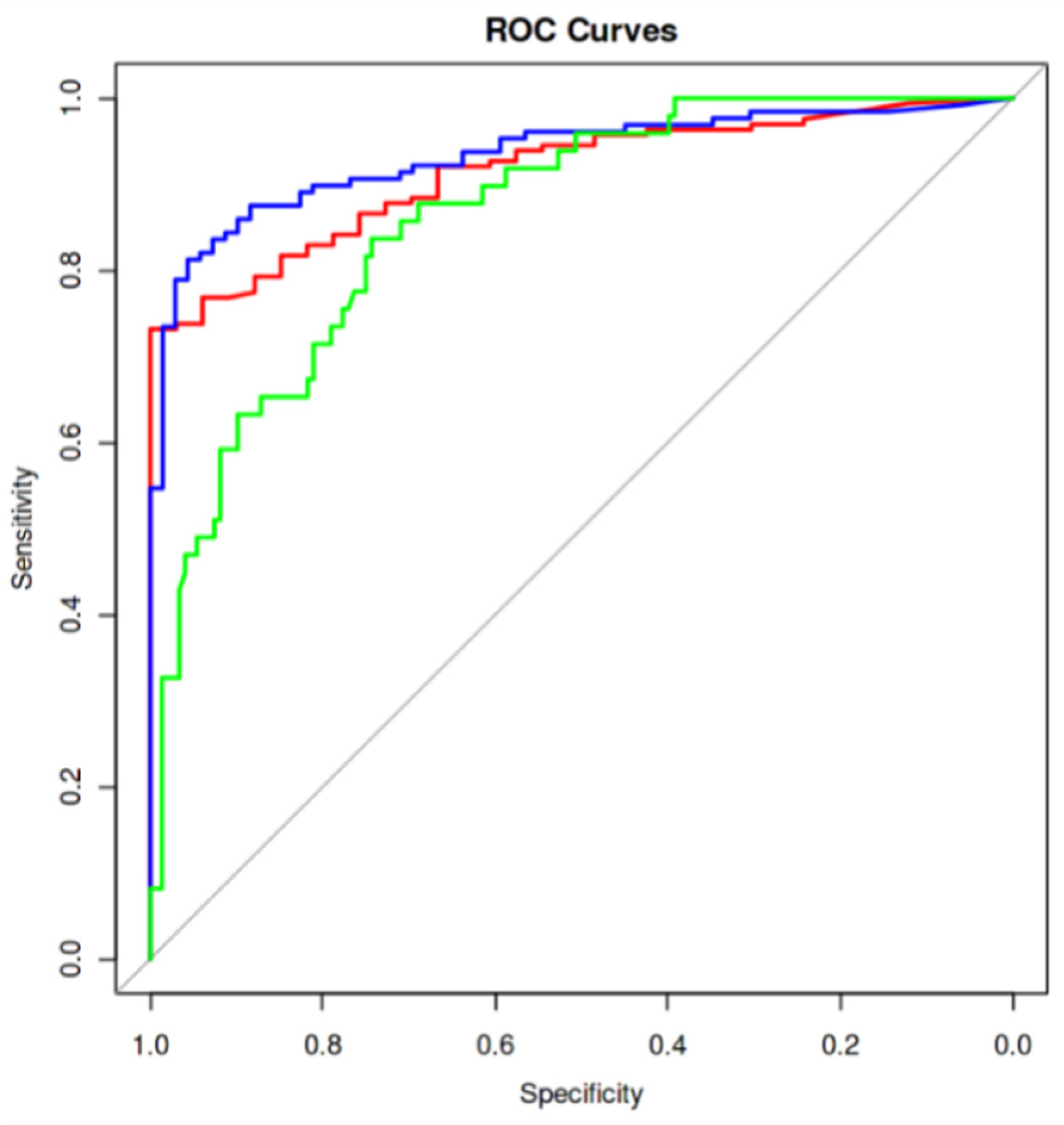 Figure 4. Receiver operating characteristic (ROC) curves evaluating the accuracy of the proposed cut-offs of Ultrasound Derived Fat Fraction (USFF) for classifying steatosis grades. Red curve represent the accuracy in differentiating absence of steatosis (S0) from mild (S1), moderate (S2), and severe steatosis (S3). Blue curve represents the accuracy in differentiating S0 and S1 from S2 and S3. Green curve represents the accuracy in differentiating S0, S1, and S2 from S3. The best performance is reached in differentiating S0 and S1 from S2 and S3 with an Area Under Curve (AUC) of 0.9335371.