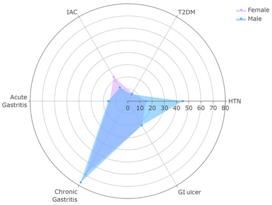 The analysis of comorbidities and pathological findings in patients with upper gastrointestinal bleeding (UGIB) and H. pylori infection, stratified by sex, is presented in Table 3. A significantly higher prevalence of arterial hypertension (HTN) was observed among males (45%) compared with females (15%) (p = 0.04). However, no significant differences were found in the prevalence of type 2 diabetes mellitus (T2DM) between genders (p > 0.92).