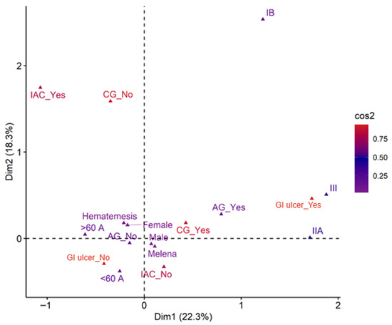 In this study, a multiple correspondence analysis (MCA) was conducted to explore the relationships among demographic, clinical, and pathological variables in patients with upper gastrointestinal bleeding (UGIB) and H. pylori infection. The variables best represented by Cos2 values were gastroduodenal ulcer and chronic gastritis. The analysis revealed that female patients over 60 years of age tended to present with hematemesis, whereas male patients were more likely to present with melena and chronic gastritis (Figure 4).
