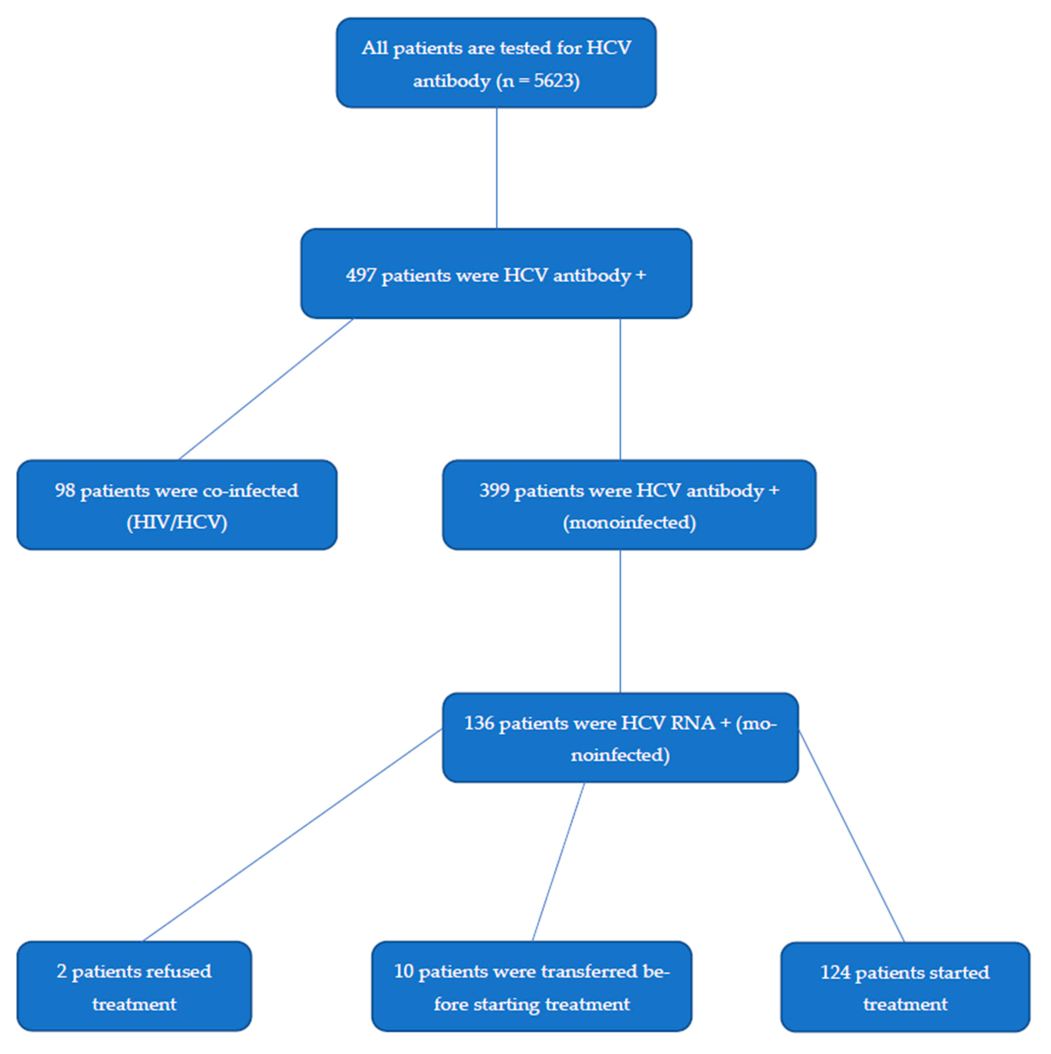 During the analysis period (2017–2025), 5623 inmates were screened, and 497 prisoners (8.8%) tested positive for anti-HCV antibodies. Among these individuals, 98 patients were co-infected with HCV and HIV, and 399 were positive for HCV-antibodies only. Of the 399 patients, 136 tested positive for HCV RNA. Two patients declined participation in the study and treatment initiation, and ten patients were transferred to another institution or released prior treatment initiation (