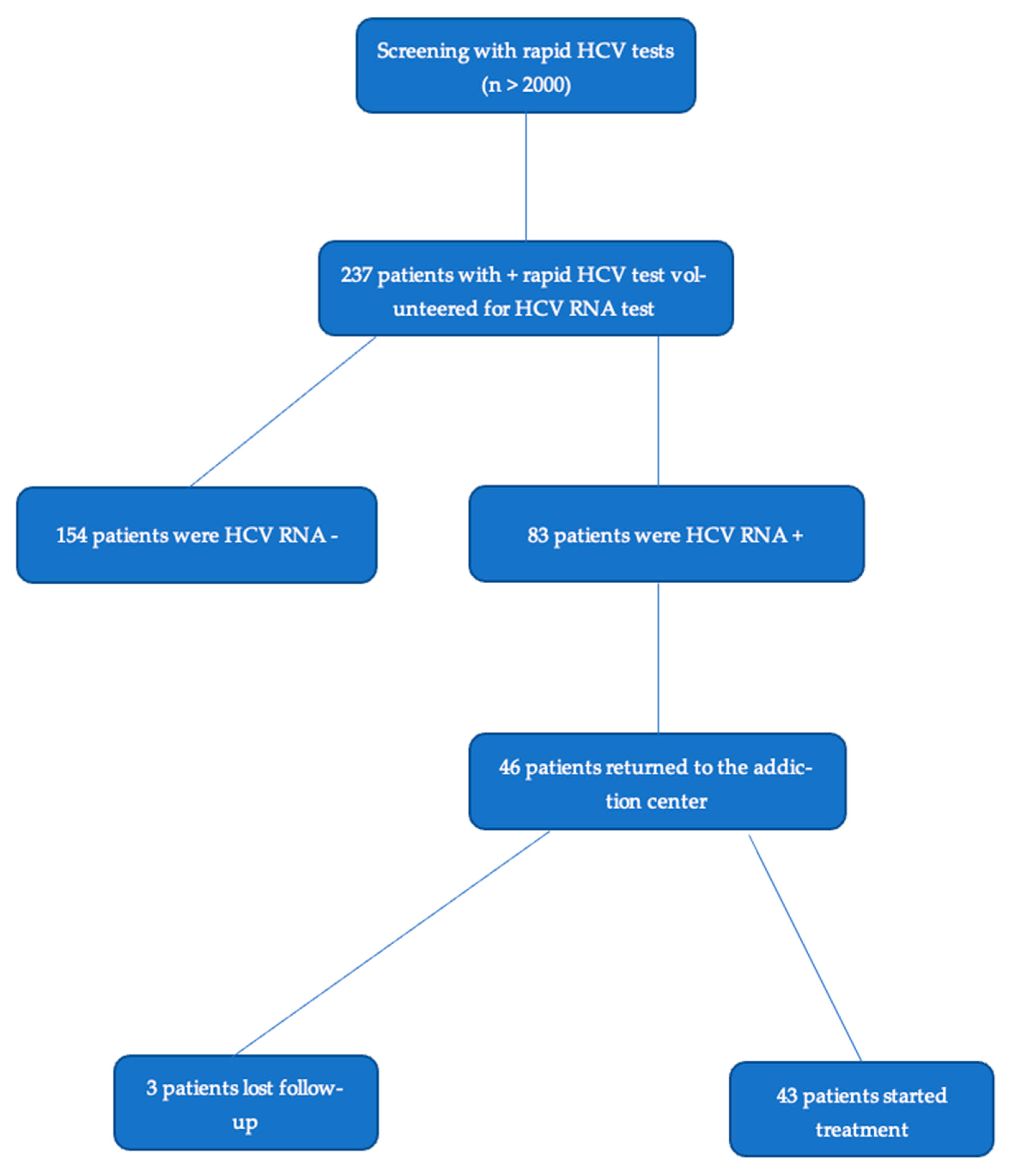 During the analysis period (2024–2025), voluntary HCV screening was performed using rapid antigen tests in more than 2000 individuals attending addiction centers. Among those with a positive rapid test, 237 volunteered for confirmatory HCV RNA testing, which identified 83 individuals with detectable HCV-RNA (56% in Cedofeita, 22% in West Porto and 22% in East Porto). Of these, only 46 returned to the addiction centers after receiving their results and initiated treatment procedures. However, during the waiting period for the medication delivery, 3 patients were lost to follow-up (